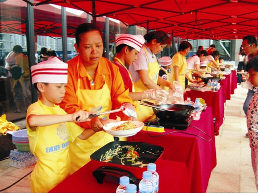 本報(bào)訊 昨日上午,南寧經(jīng)濟(jì)技術(shù)開發(fā)區(qū)在綠港·國(guó)際中心開展了以“關(guān)愛農(nóng)民工·綠港小廚神”親子活動(dòng),吸引了南寧經(jīng)開區(qū)園林綠化工人、水電維修物業(yè)工人、保潔人員等300多名進(jìn)城務(wù)工人員及其子女參加。在活動(dòng)現(xiàn)場(chǎng),參賽小選手們?cè)诟改傅闹笇?dǎo)下井井有條地備菜、炒菜、起鍋,忙得不亦樂乎。