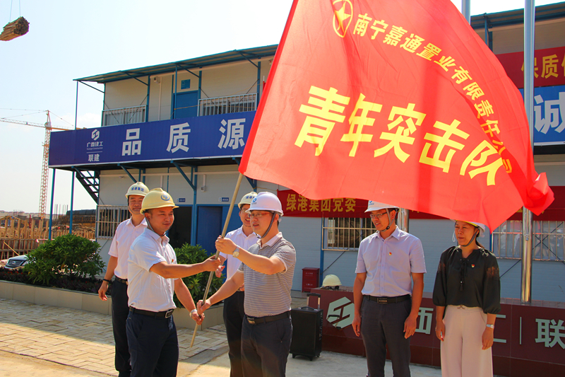 在授旗儀式中,集團(tuán)黨委書(shū)記、董事長(zhǎng)、總經(jīng)理龔國(guó)強(qiáng)對(duì)南寧科技產(chǎn)業(yè)園項(xiàng)目人員前期所做出的工作給予了充分肯定,贊揚(yáng)了黨員先鋒隊(duì)員、青年突擊隊(duì)員和工人朋友們?yōu)轫?xiàng)目建設(shè)所付出的艱苦和努力,當(dāng)前項(xiàng)目進(jìn)展取得了較好的成績(jī)。自8月12日南寧科技產(chǎn)業(yè)園項(xiàng)目正式開(kāi)工以來(lái),嘉通公司黨支部帶領(lǐng)工人們?nèi)找箍喔?,千方百?jì)克服惡劣的臺(tái)風(fēng)天氣等不利因素,在短短的2個(gè)月時(shí)間便完成1#樓廠房一層的搭設(shè)模板,2#、3#樓回填基礎(chǔ)土方,4#樓防水保護(hù)層澆筑以及9#宿舍樓基礎(chǔ)承臺(tái)澆筑等工作,充分展現(xiàn)了綠港鐵軍風(fēng)采。下一步,希望全體黨員先鋒隊(duì)、青年突擊隊(duì)隊(duì)員們以此次授旗為契機(jī),繼續(xù)發(fā)揚(yáng)綠港鐵軍精神,創(chuàng)先爭(zhēng)優(yōu),攻堅(jiān)克難,加快推進(jìn)項(xiàng)目建設(shè),確保項(xiàng)目如期建成交付。