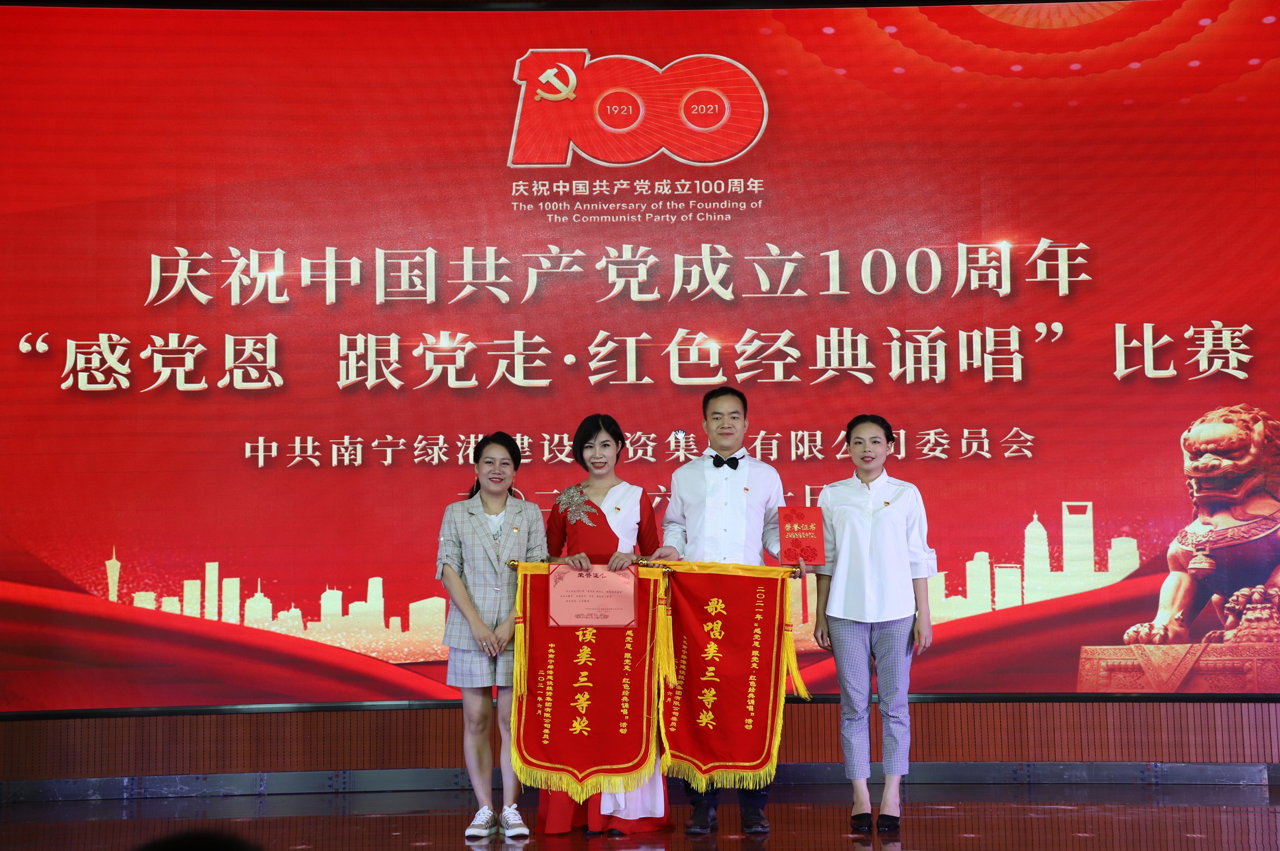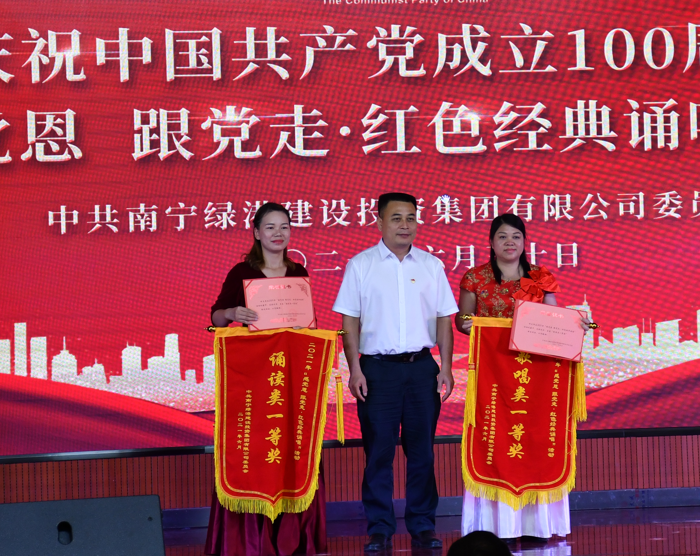 綠港集團(tuán)黨委書記、董事長龔國強(qiáng)和黨委副書記、總經(jīng)理鄧?yán)^慧為獲得誦唱類二等獎的機(jī)關(guān)一支部頒獎
