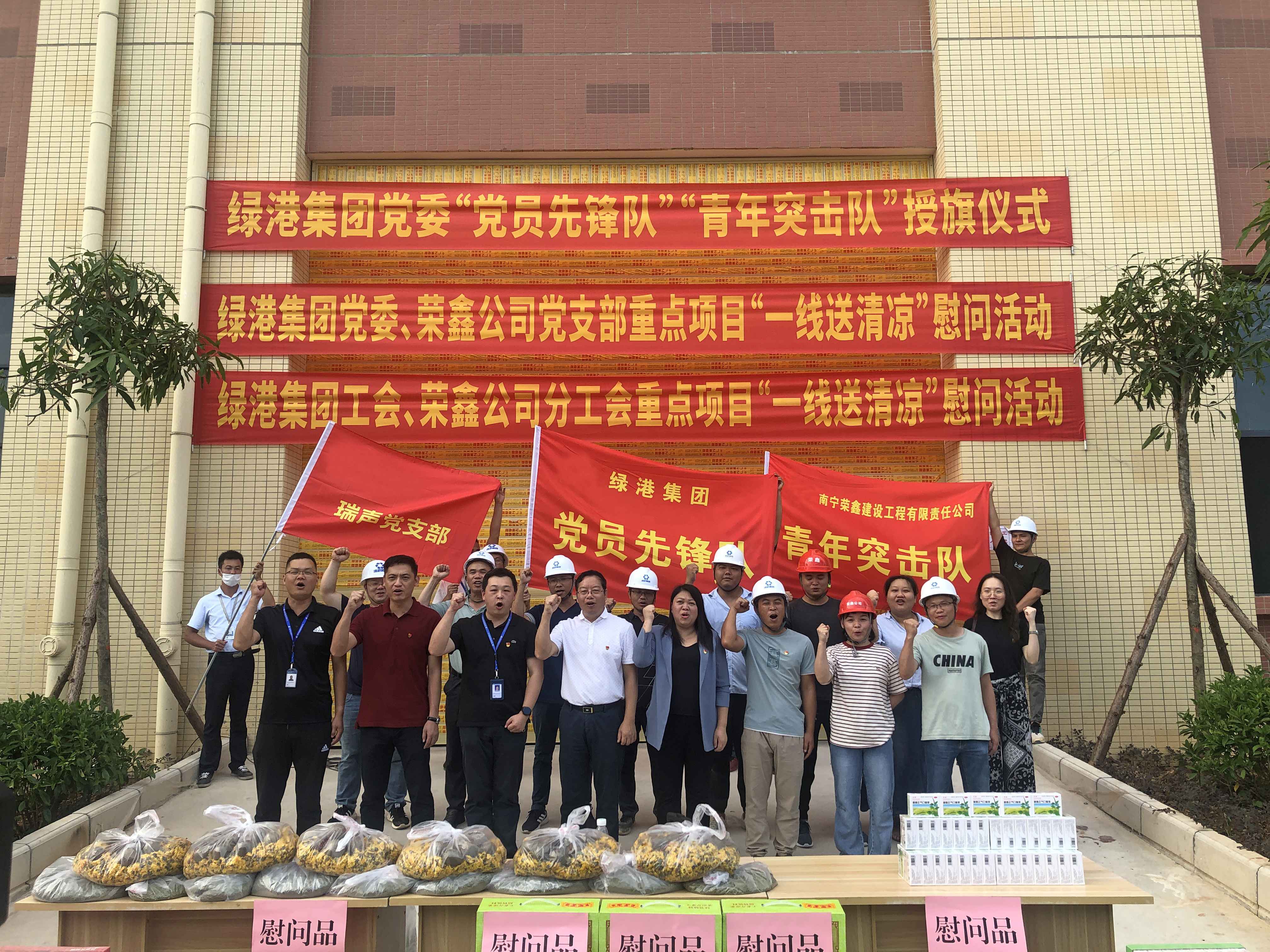 7月14日,由綠港集團黨委主辦,榮鑫公司黨支部、榮鑫公司工會承辦的 “黨員先鋒隊”“青年突擊隊”授旗暨“一線送清涼”活動在瑞聲三期項目現(xiàn)場開展。榮鑫公司黨支部書記、總經(jīng)理李汝埠帶領(lǐng)榮鑫公司領(lǐng)導(dǎo)班子,頂著烈日、迎著熱浪,來到集團重點項目——瑞聲科技(南寧)廠房裝修工程(三期)施工現(xiàn)場,親切看望慰問在炎炎夏日中奮戰(zhàn)在項目建設(shè)一線的“黨員先鋒隊”“青年突擊隊”隊員及各施工班組的建設(shè)者,送去了集團黨委、榮鑫公司黨支部、榮鑫公司工會的關(guān)心和敬意,為他們加油鼓勁、提振士氣。瑞聲科技(南寧)有限公司副總經(jīng)理李博及項目相關(guān)負(fù)責(zé)人參加活動。