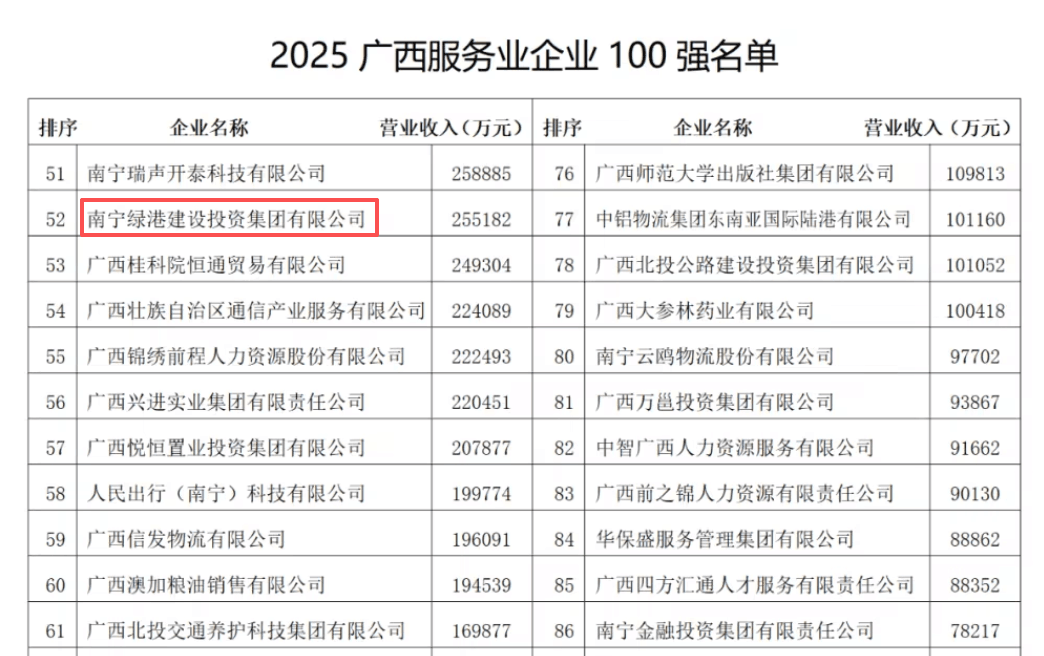 近日,廣西企業(yè)與企業(yè)家聯(lián)合會(huì)、廣西工業(yè)經(jīng)濟(jì)聯(lián)合會(huì)聯(lián)合發(fā)布“2025廣西服務(wù)業(yè)企業(yè)100強(qiáng)”榜單。南寧五象經(jīng)投集團(tuán)下屬企業(yè)綠港集團(tuán)憑借穩(wěn)健的綜合實(shí)力、突出的發(fā)展成效,第4次榮登該榜單并位列第52位,彰顯了公司在服務(wù)區(qū)域發(fā)展、推動(dòng)產(chǎn)業(yè)升級(jí)中的堅(jiān)實(shí)底氣與強(qiáng)勁動(dòng)能。